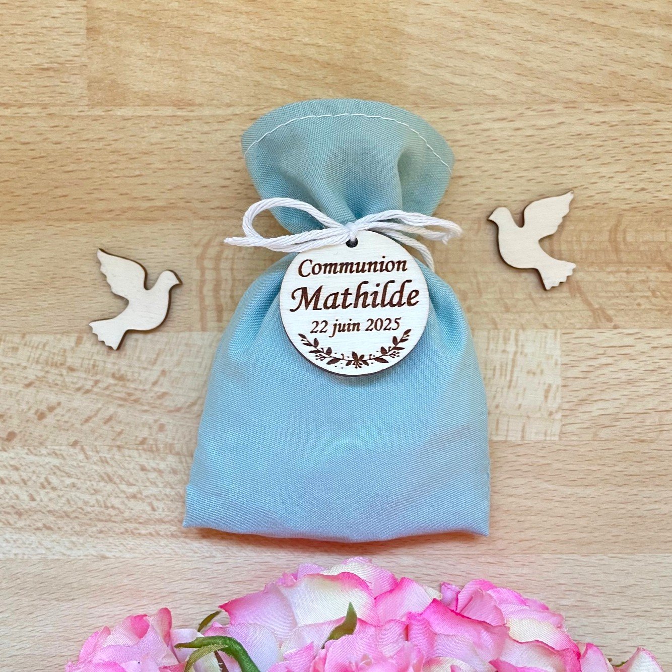 Pochons en tissu pour dragées baptême communion personnalisés avec Étiquette gravée en bois, pour y glisser les dragées lors de vos baptêmes, communions, anniversaires et jolis évènements.