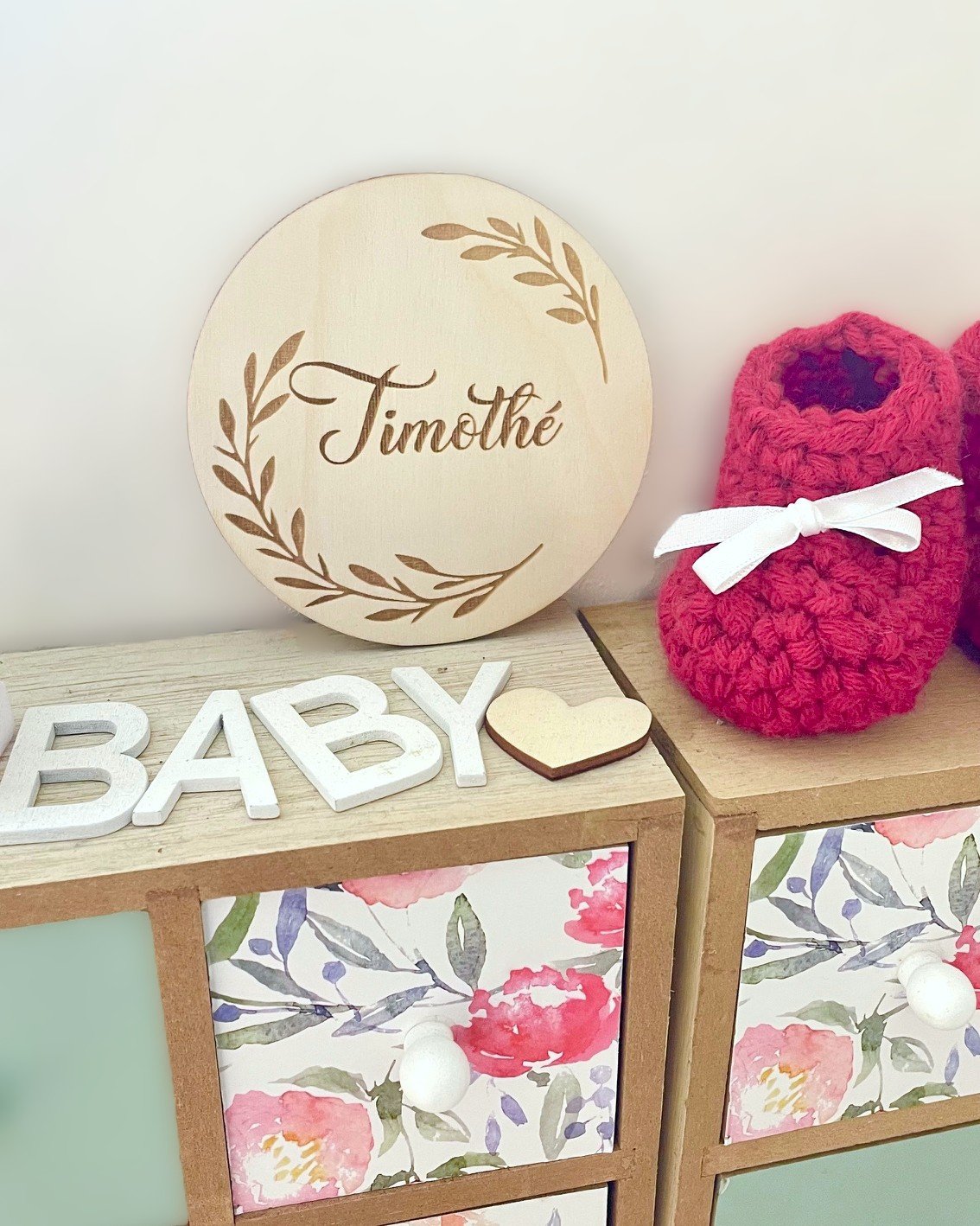 Carte naissance en bois « Couronne de feuilles » personnalisée avec prénom ou mot, rien de mieux que des cartes étapes pour offrir en cadeau de naissance ou pour vous faire plaisir en tant que future maman.