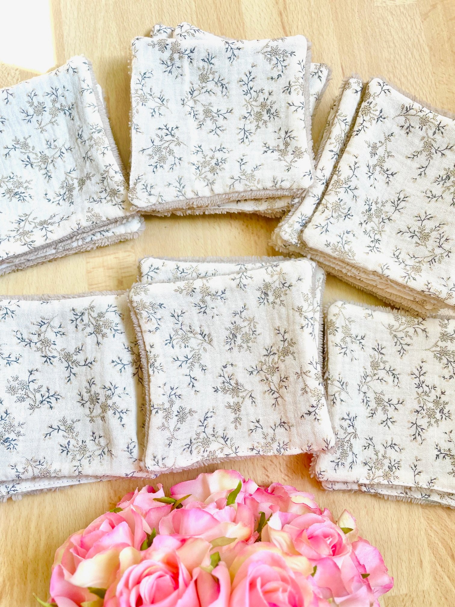 ATELIERNAT~ Coton lingette lavable bambou fleuri beige, cotons réutilisables Démaquillants Soins bébé ~