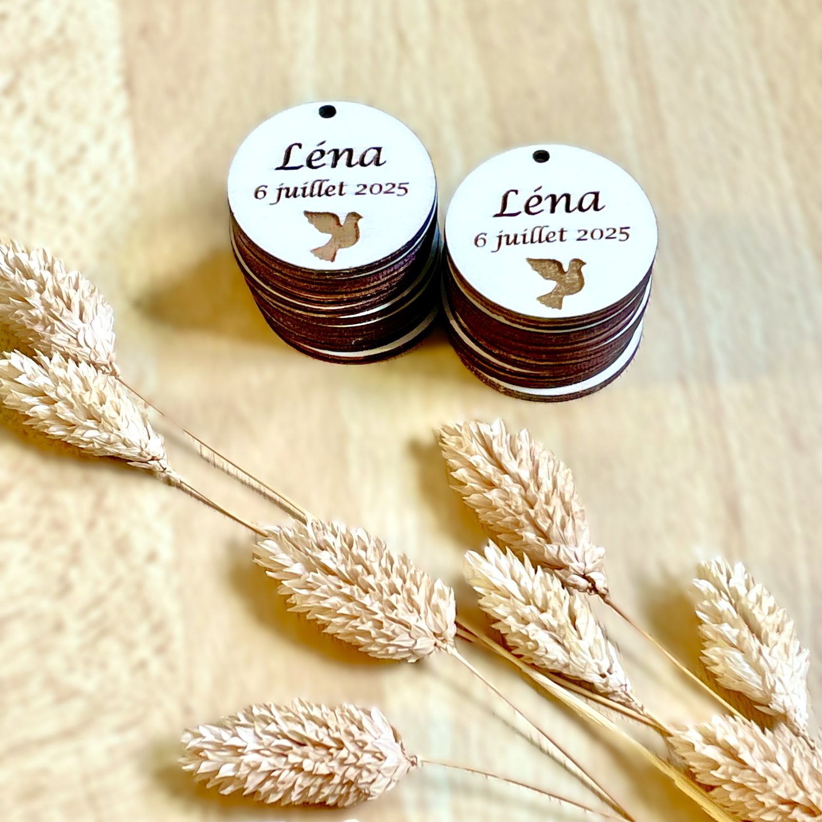 Étiquette en bois ronde colombe pour vos évènements (baptême, communion, mariage, anniversaire).