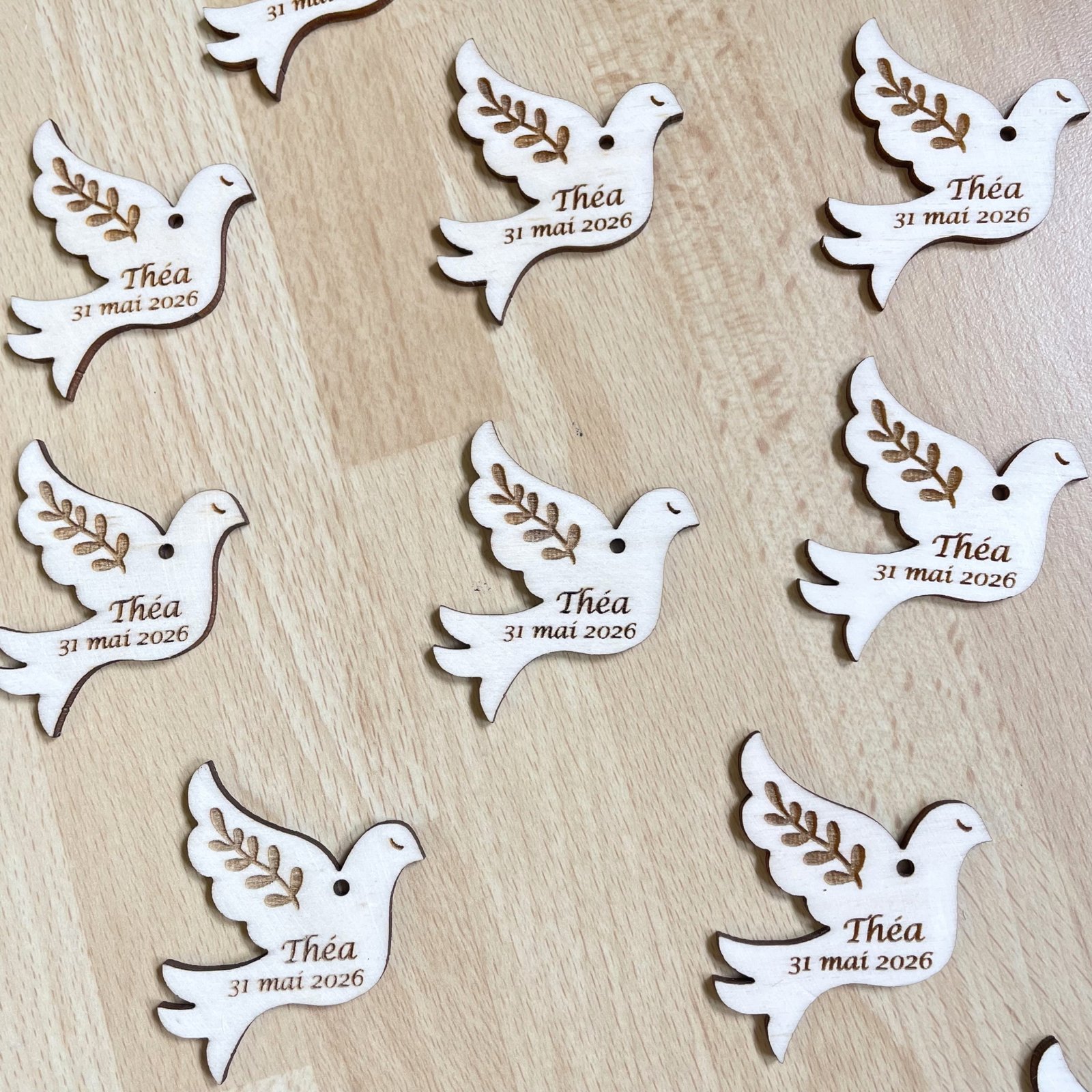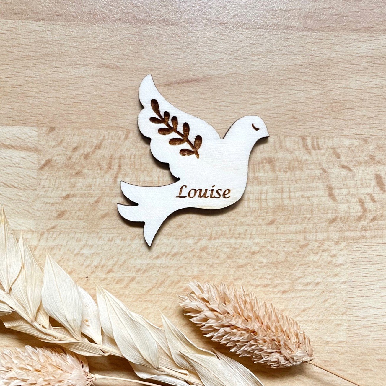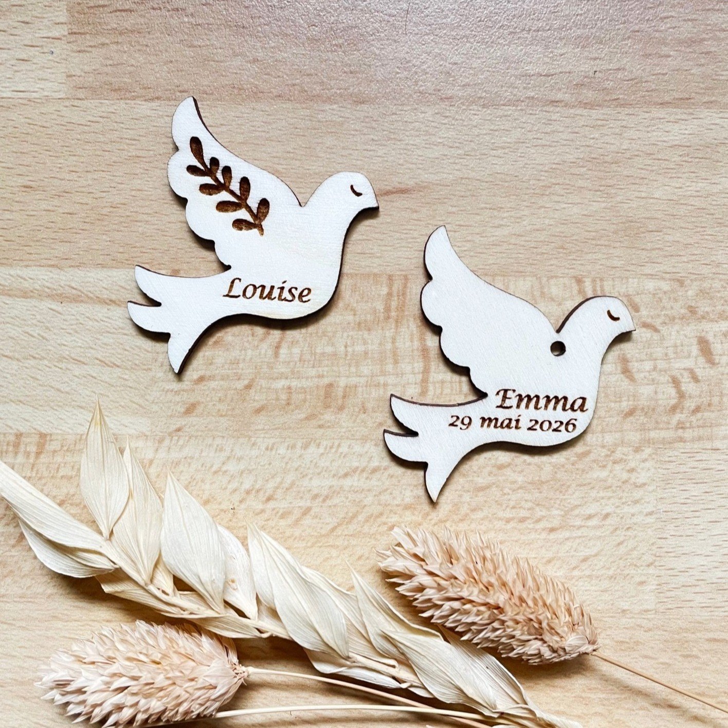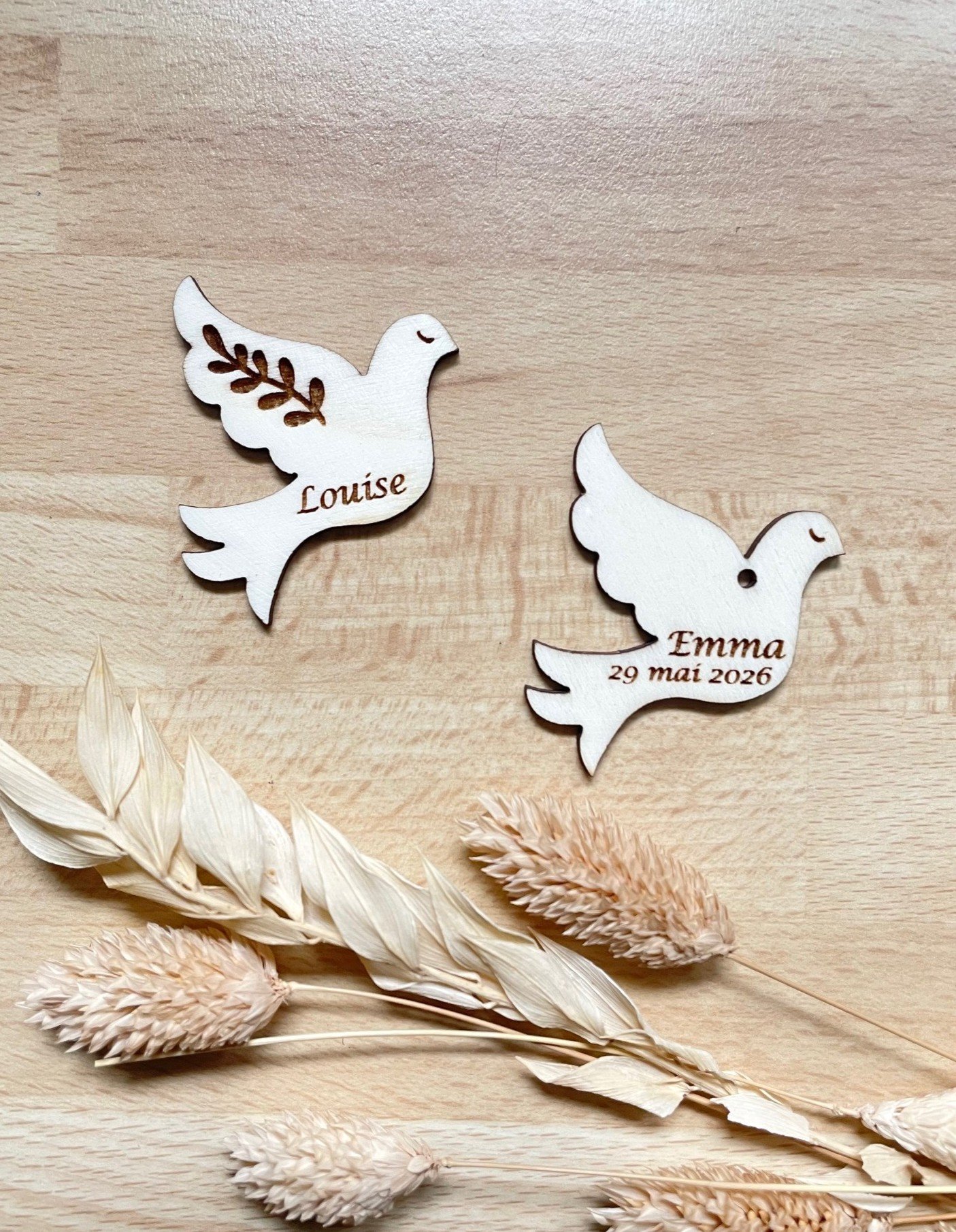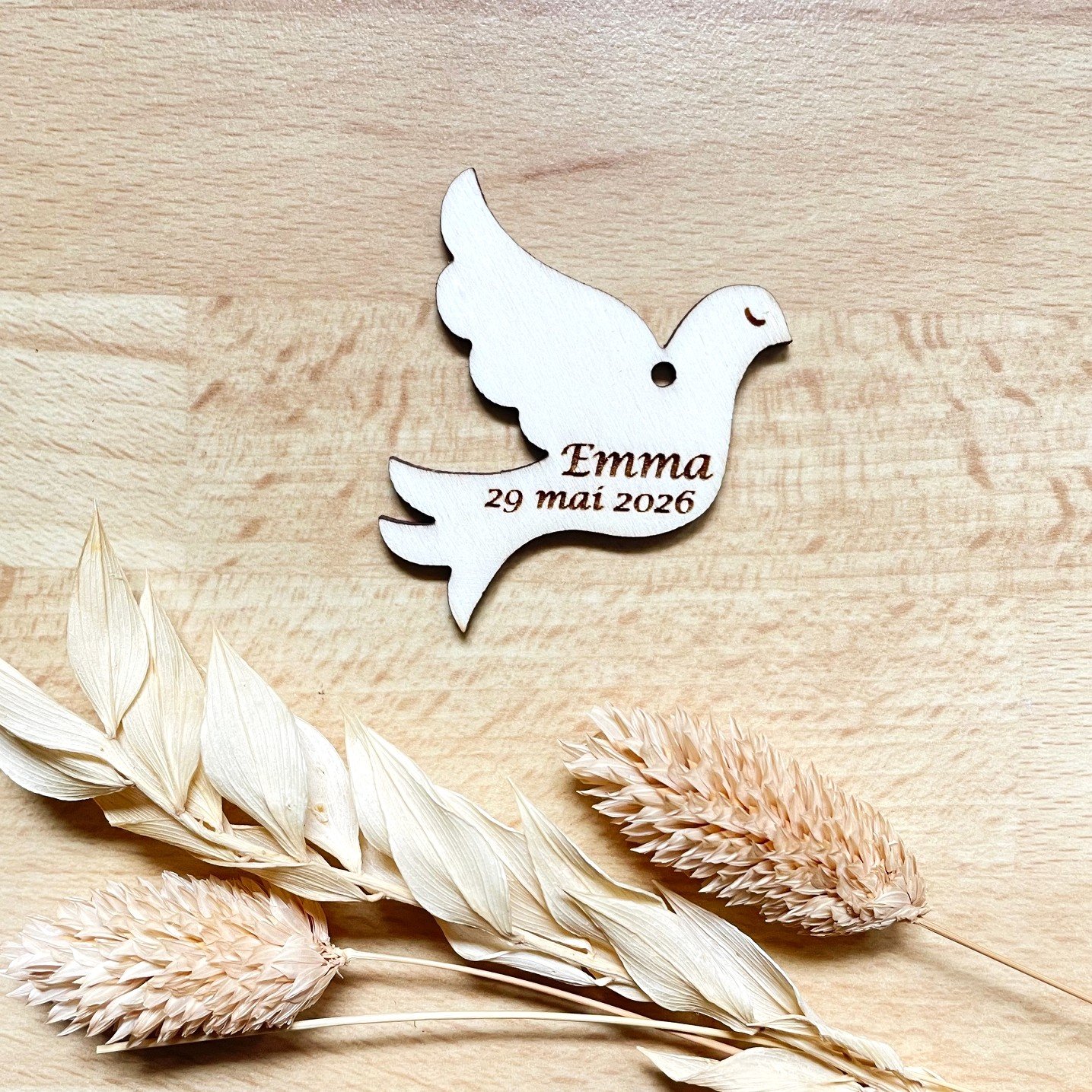 ATELIERNAT~ Jolie Étiquette Colombe rameau en bois pour Baptême Communion Profession de foi, personnalisée un prénom, une date pour vos évènements (baptême, communion, mariage, profession de foi) ~