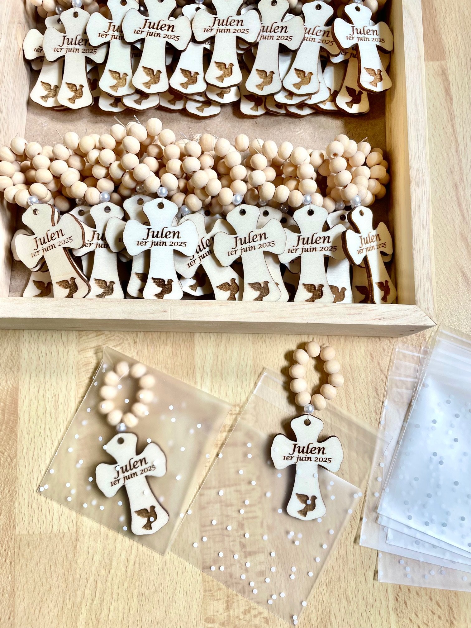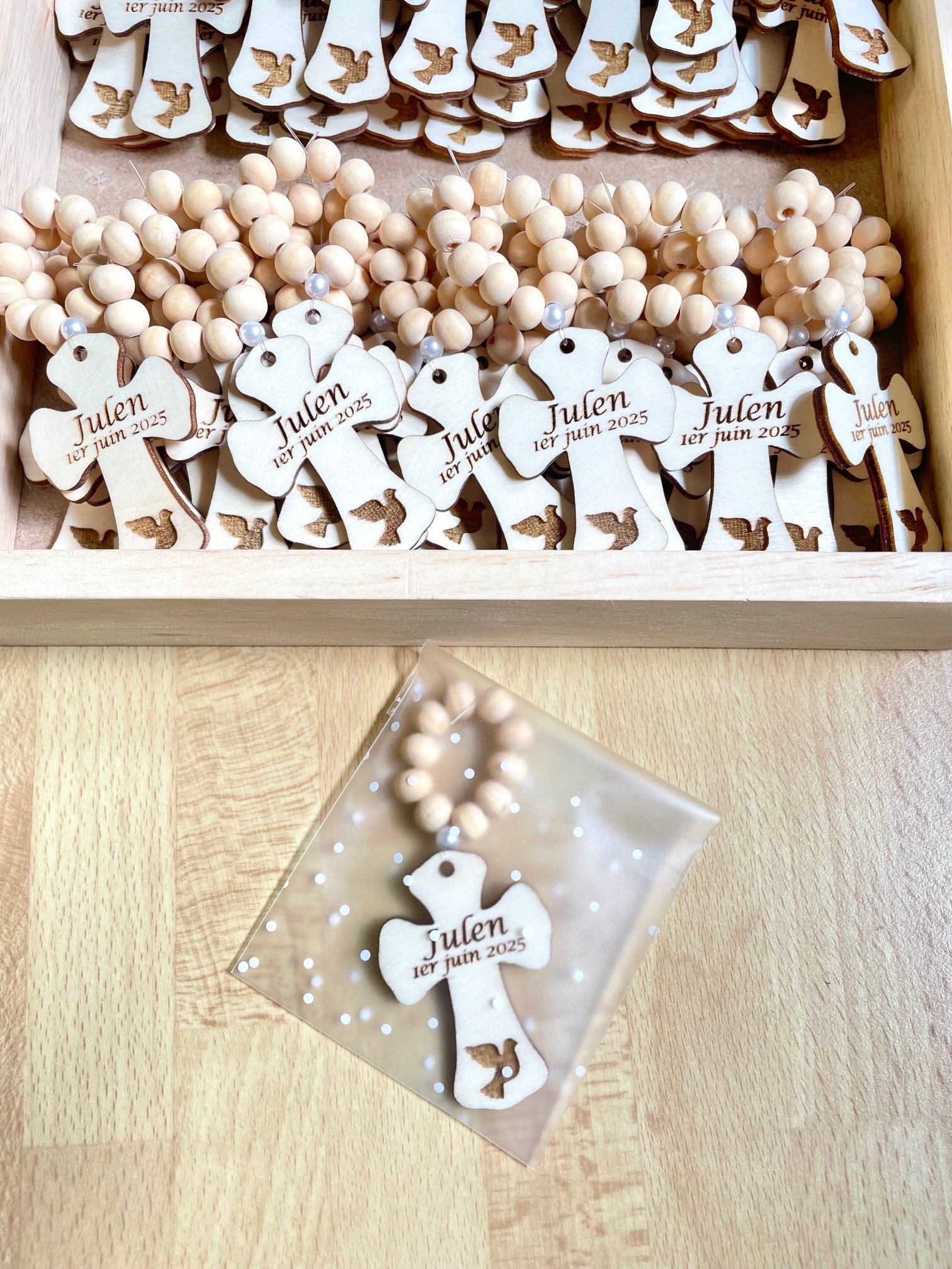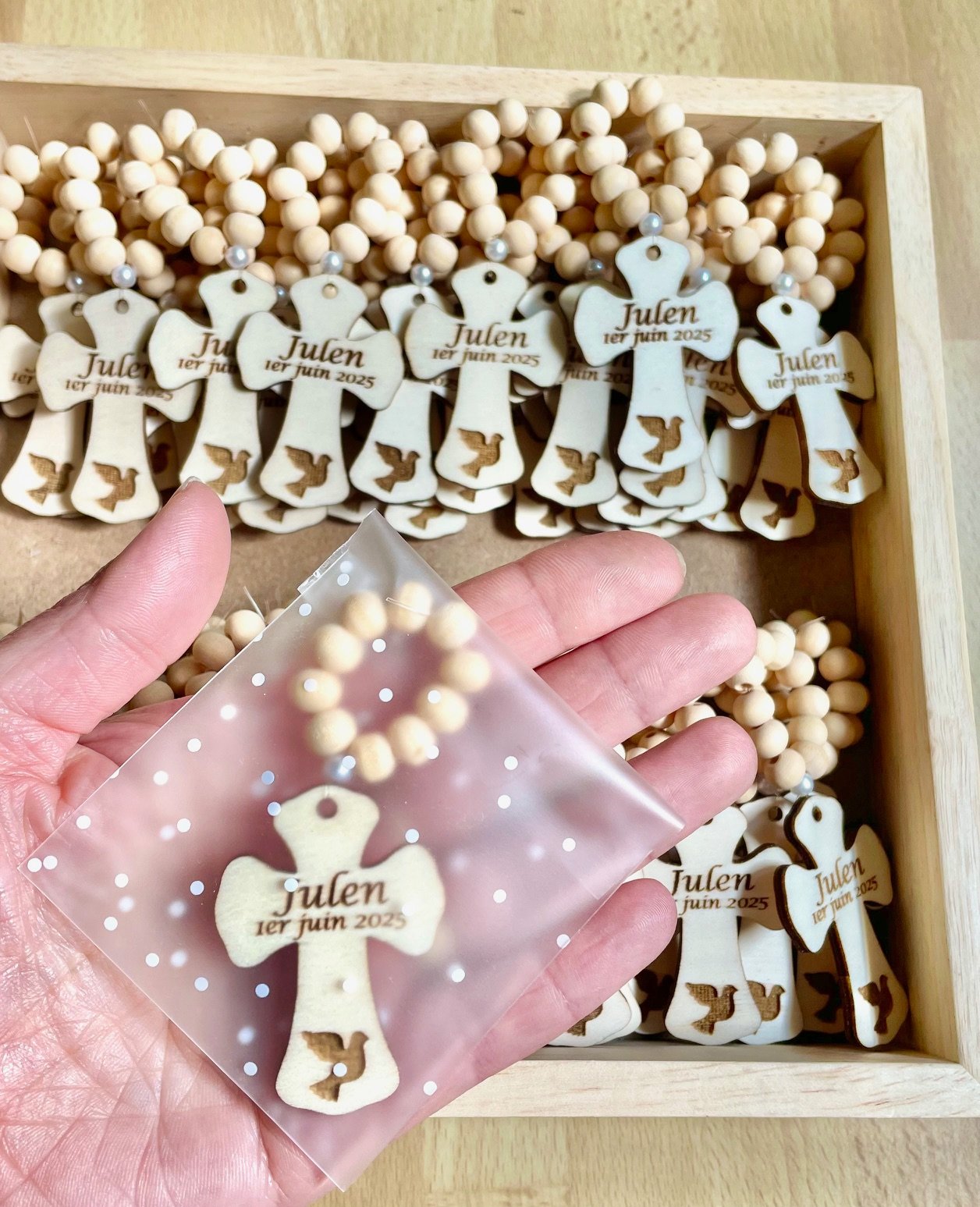 ATELIERNATMini chapelet personnalisé croix gravée dans sachet, rosaire de poche en bois, dizainier Baptême Communion Confirmation, Cadeau faveur invités.