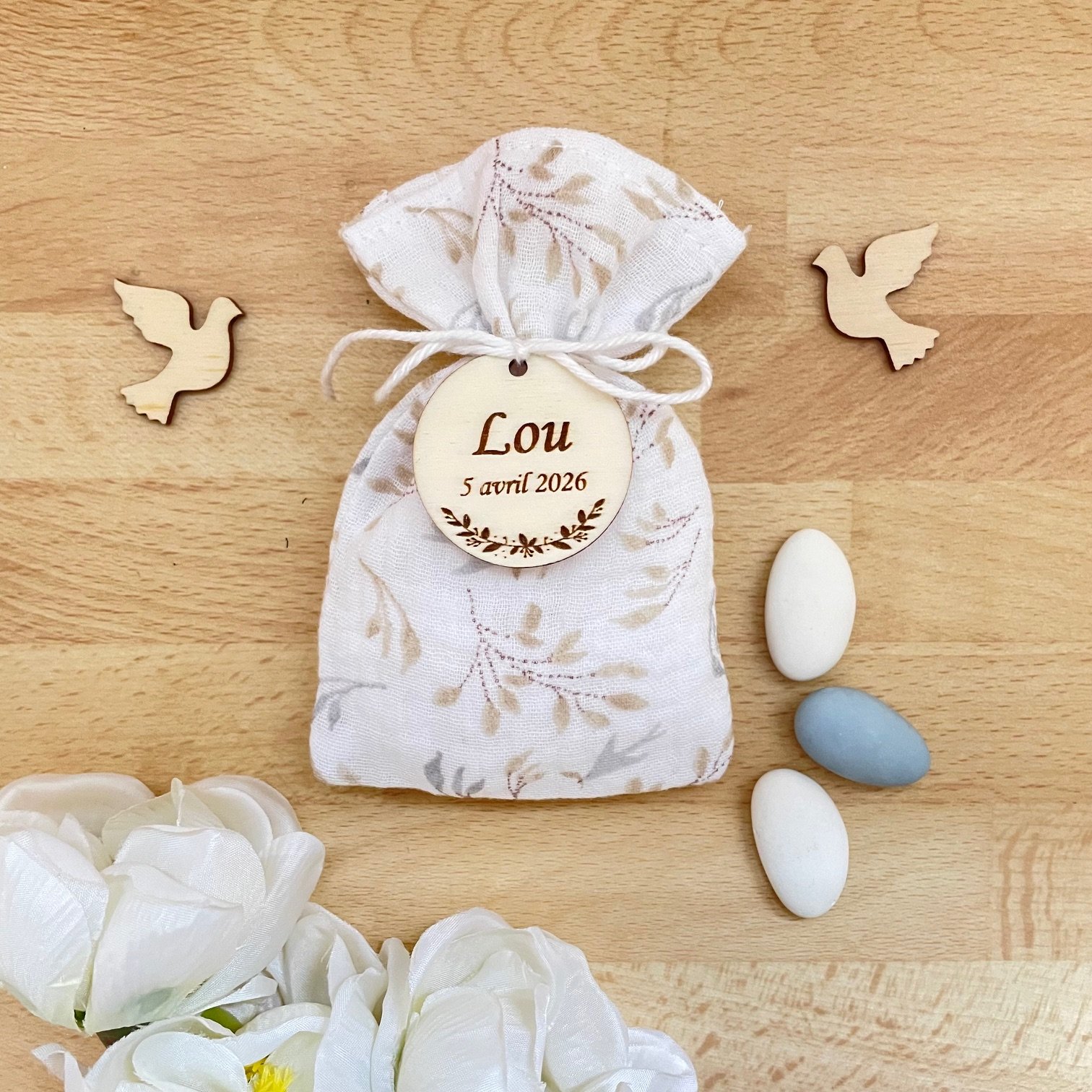 Joli ballotin à dragées fleuri beige (1ère photo) étiquette en bois personnalisée forme au choix pour baptême communion, pour y glisser les dragées lors de vos baptêmes, communions, anniversaires et jolis évènements.